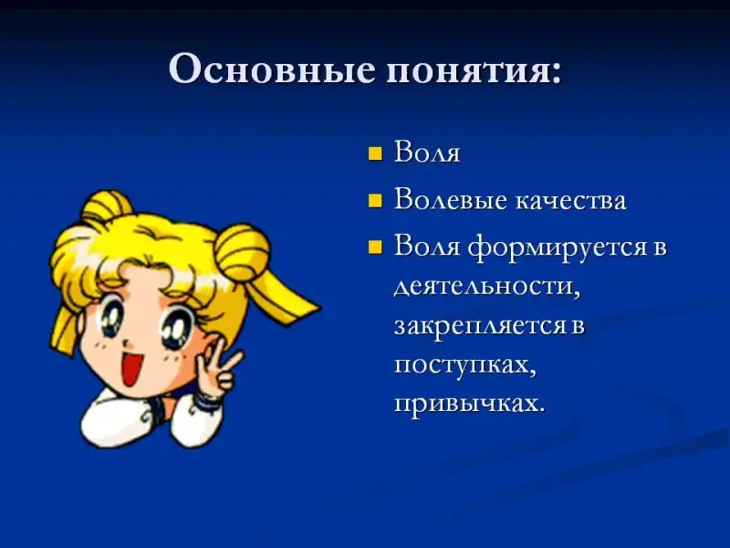 | Воля - способность преодолевать трудности, упорство и мужество в достижении поставленной цели, способность человека управлять своим поведением. |