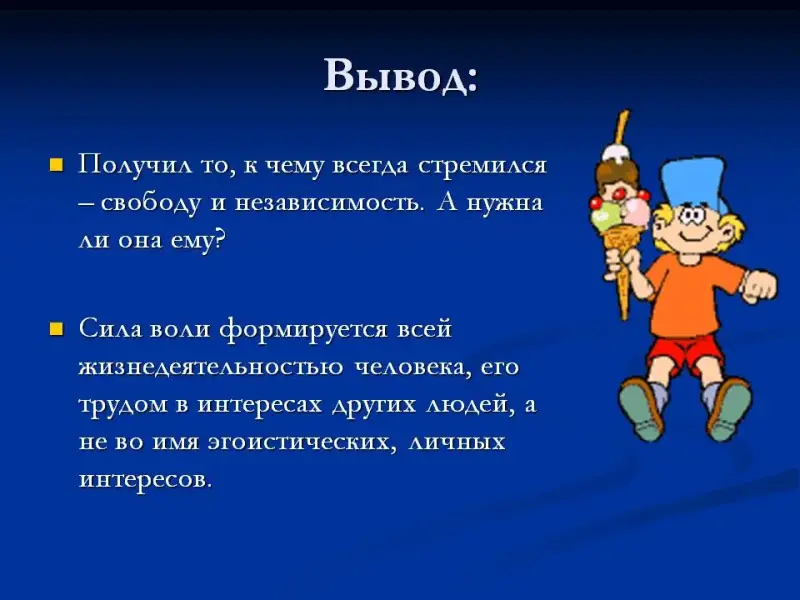 Вывод: Получил то, к чему всегда стремился - свободу и независимость. А нужна ли она ему?