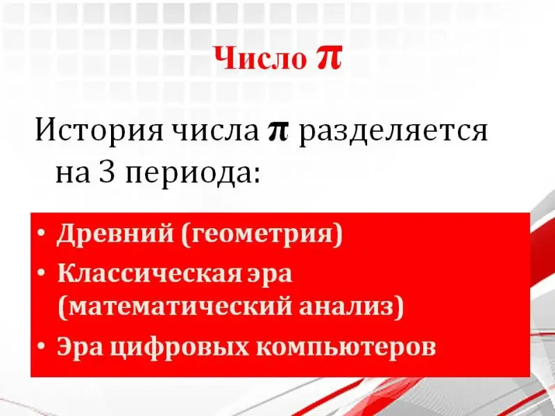 История числа π шла параллельно с развитием всей математики. Некоторые авторы разделяют весь процесс на 3 периода: древний период, в течение которого π изучалось с позиции геометрии, классическая эра, последовавшая за развитием математического