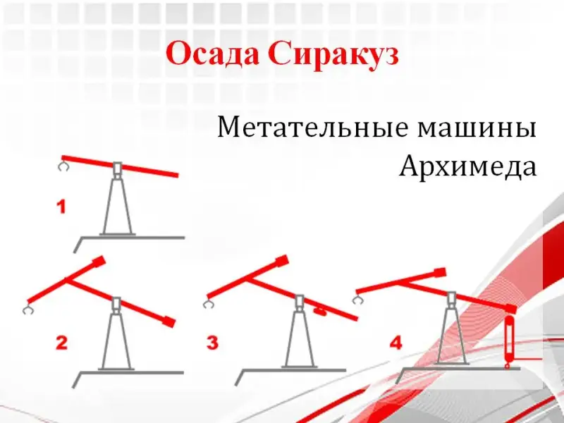 Слава Архимеда-инженера была внезапной и ошеломляющей, оставившей след в сознании всего эллинистического мира, перешагнувшей границы стран и столетий. Инженерный гений Архимеда проявился при драматических обстоятельствах осады Сиракуз весной 214 г. до н.э., когда Архимеду было уже за семьдесят. Эта победа над римлянами стала величайшим триумфом, который когда-либо выпадал на долю ученых. (Слайд 5)