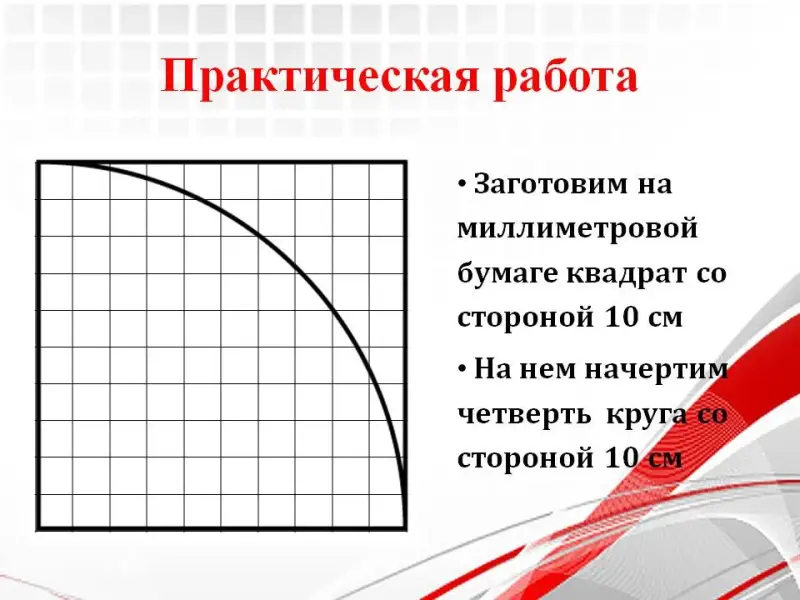 Учащиеся заготавливают на миллиметровой бумаге квадрат со стороною 10 см. На нем чертится четверть круга радиусом 10 см. (Слайд 9)