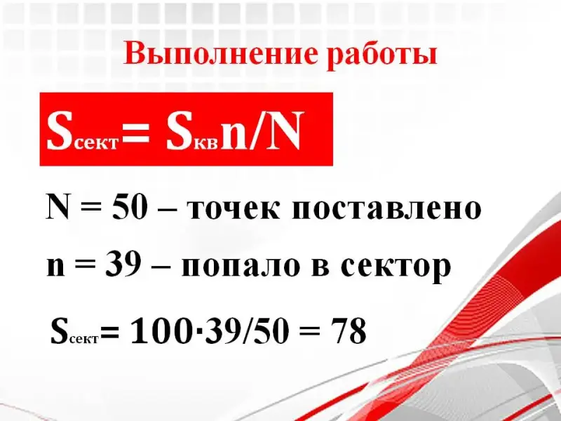 SKB = 100, N - количество всех поставленных точек, n - количество точек, попавших внутрь сектора. (Слайды 14-16).