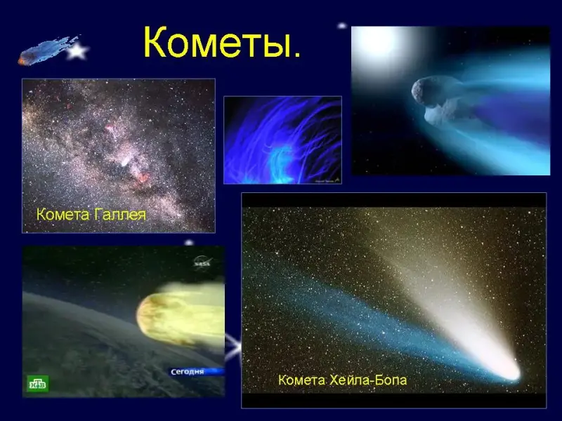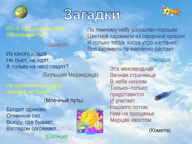 | - Что такое метеоры? | - Вспышки света, возникающие при сгорании в земной атмосфере частичек космической пыли. |