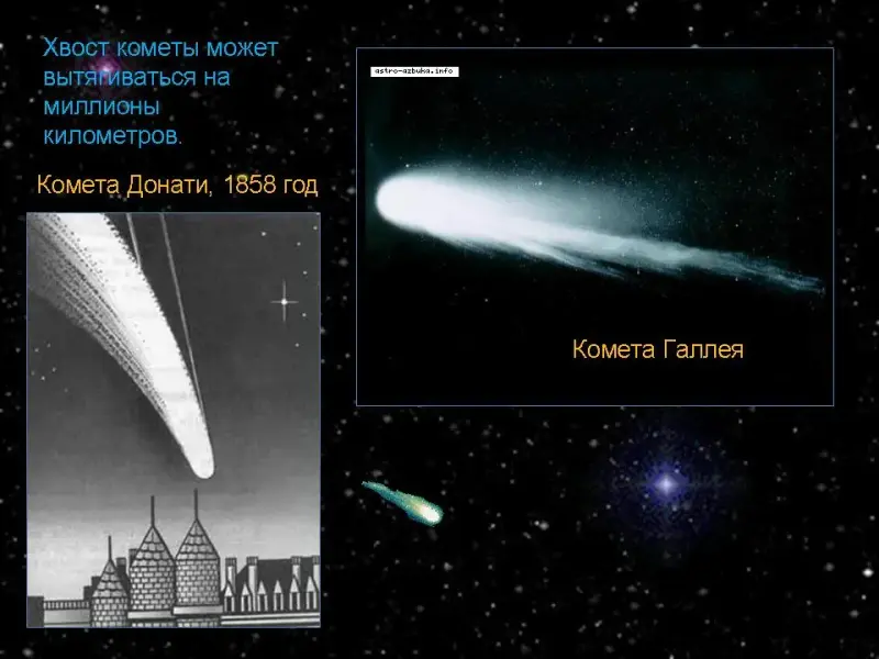Почти занимая полсвета, Загадочна, очень красива Парит над Землёю комета. И хочется думать: Откуда Явилось к нам светлое чудо? И хочется плакать, когда Оно улетит без следа. |