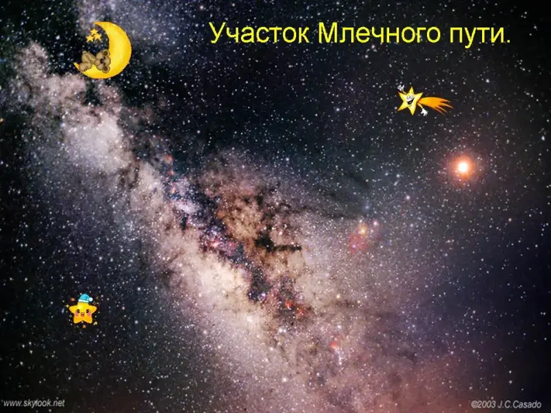 | Слайд 39 (Млечный путь - наша Галактика), Слайд 40 (Участок Млечного пути, звучит "Песня звездочёта" из фильма "Про Красную шапочку"), Слайд 41, 42 (Многообразие галактик), Слайд 43 (Большое и Малое Магеллановы облака). | |