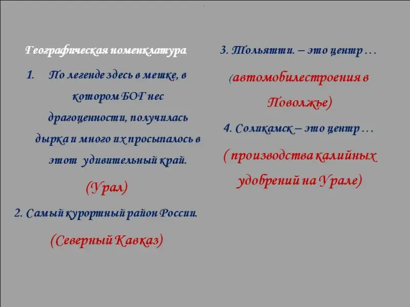 - Соликамск - это… (центр производства калийных удобрений на Урале).