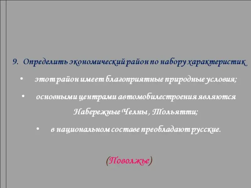 (Всем учащимся поочереди подойти к столу, взять карточку с указанной характеристикой одного из районов, и пока учитель считает до 5, нужно встать у стола с табличкой экономического района, к которому относится признак. Затем учащиеся читают признаки района по своим карточкам).
