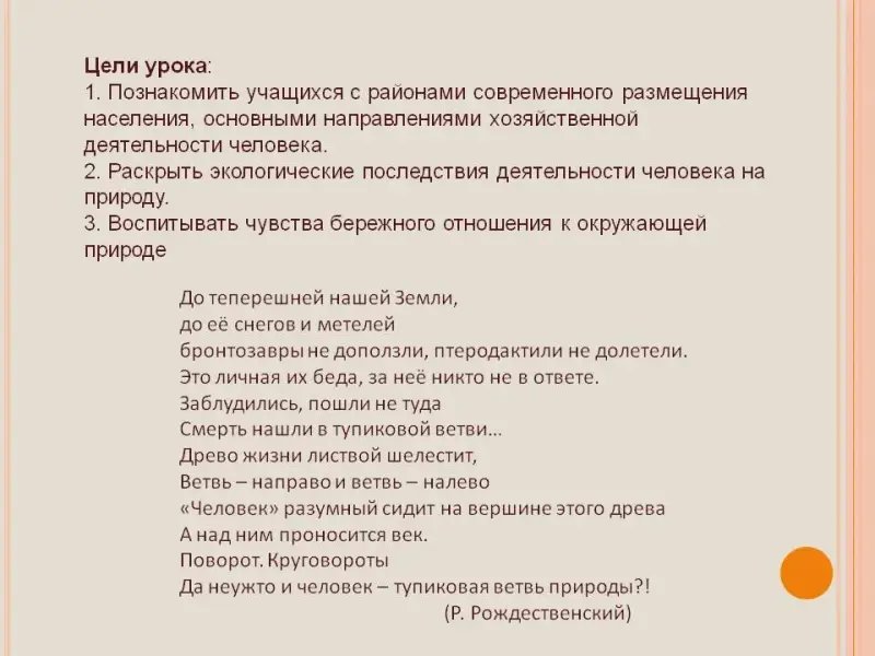 - Познакомить учащихся с районами современного размещения населения, основными направлениями хозяйственной деятельности человека.
