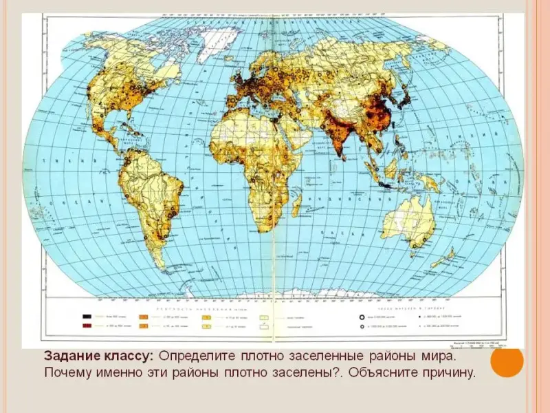 Задание классу: Определить по карте плотно населенные районы мира.