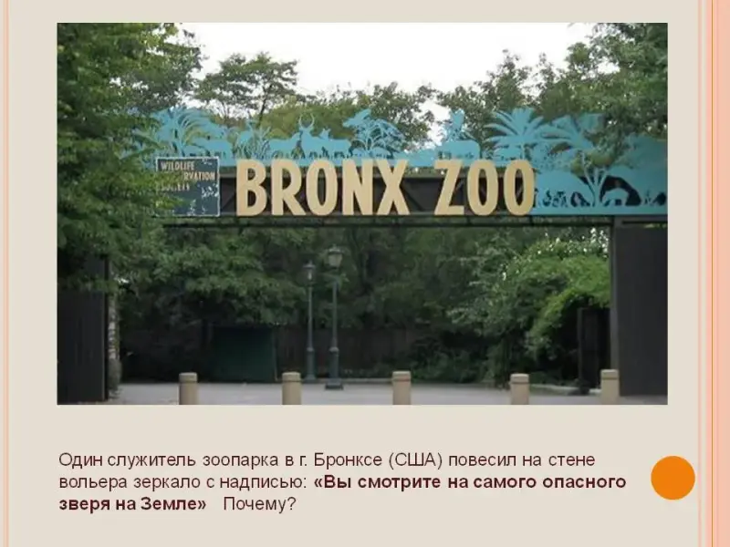 Слайд 6. Один служитель зоопарка в г. Бронксе (США) повесил на стене вольера обыкновенное зеркало с надписью: «Вы смотрите на самого опасного зверя на Земле»