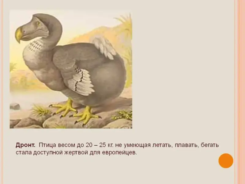 Дронты были нелетающими птицами величиной с гуся. Предположительно взрослая птица весила 20-25 кг., в высоту достигала метра, лапы дронта с четырьмя пальцами напоминали индюшачьи, клюв массивный. Дронты не умели летать, хорошо плавать, быстро бегать. В результате многовековой эволюции дронты утратили крылья, на них осталось всего несколько перьев, а хвост превратился в маленький хохолок. Дронты водились на Маскаренских островах в Индийском океане. Дронты полностью вымерли с появлением на островах европейцев. Охота на дронта стала источником пополнения корабельных запасов, Для охоты достаточно было подойти и ударить палкой по голове.
