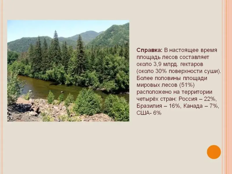 Справка: В настоящее время площадь лесов составляет около 3,9 млрд. гектаров (около 30% поверхности суши).