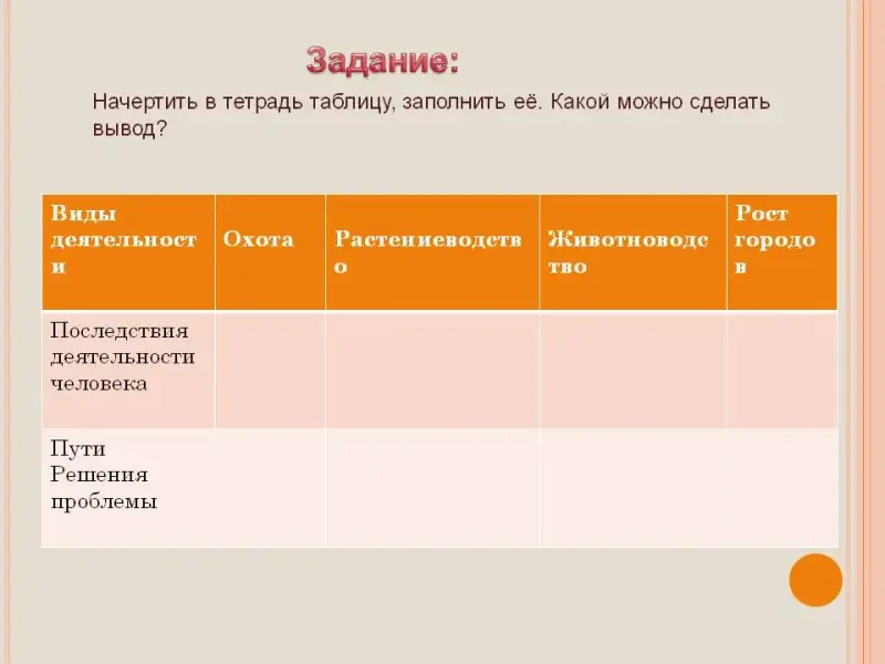 | Виды деятельности | Охота | Растениеводство | Животноводство | Рост городов |