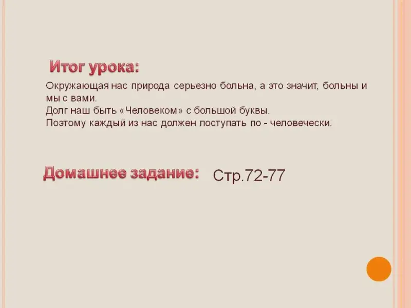 Итог урока: Окружающая нас природа серьезно больна, а это значит, больны и мы с вами. Долг наш быть «Человеком» с большой буквы. Поэтому каждый из нас должен поступать по-человечески.