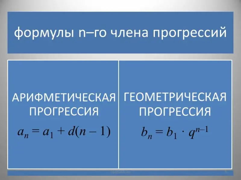 Данная презентация дает наглядное представление о соответственных формулах двух прогрессий, помогает увидеть всю последовательность задач от самых простых до сложных. Яркая визуализация и логика в повторении способствует пониманию и осмысливанию решений.