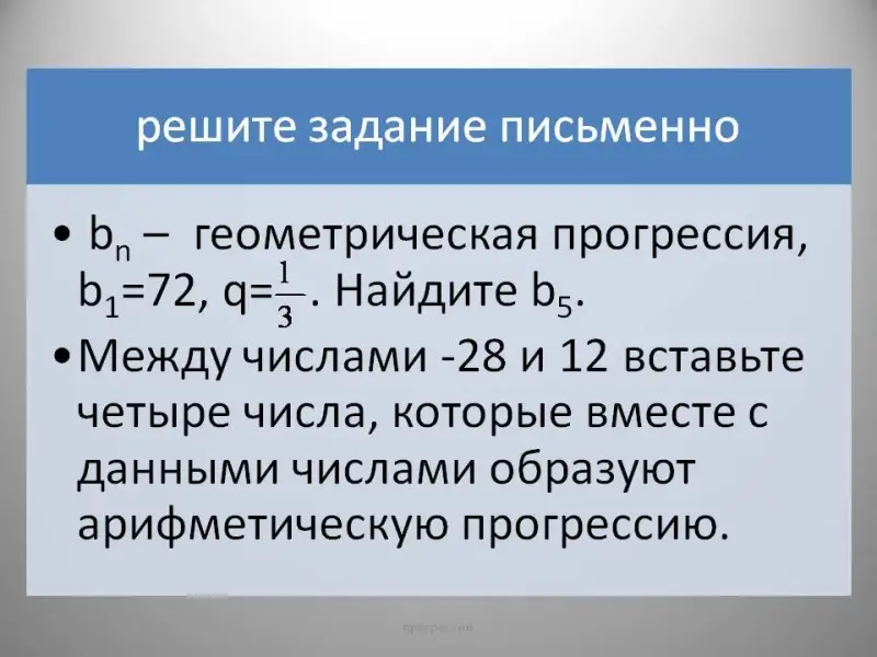2) Между числами - 28 и 12 вставьте четыре числа, которые вместе с данными числами образуют арифметическую прогрессию.