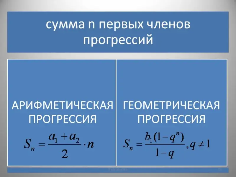 №12. Формулы суммы n первых членов арифметической и геометрической прогрессий.