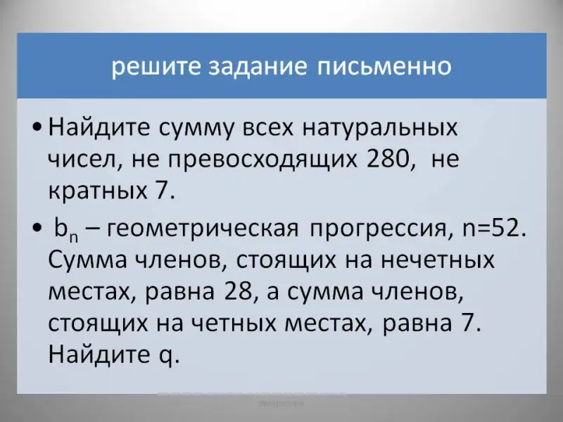 4) bn - геометрическая прогрессия, n = 52. Сумма членов, стоящих на нечетных местах, равна 28, а сумма членов, стоящих на четных местах, равна 7. Найдите q. (Ответ: 0,25)