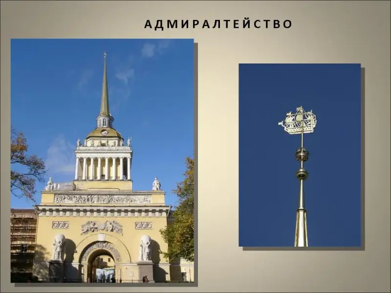 Фрегат, украшающий шпиль Адмиралтейства, раскрывает назначение здания как судостроительной верфи и символизирует выход России к морю и создание отечественного военно-морского флота на Балтике.