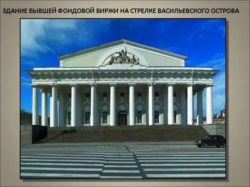 Грандиозен и величествен архитектурный ансамбль Стрелки Васильевского острова. Удивительное впечатление производит Стрелка, когда смотришь на нее издали, со стороны Троицкого моста. Кажется, будто большой и необыкновенный корабль плывет навстречу, разрезая низким носом воды широкой полноводной реки, деля ее на два рукава - Большую Неву и Малую. На носу, над серо-свинцовой гладью воды, стают две причудливые красно-кирпичные башни, а в просвете между ними, где должен виднеться капитанский мостик, возвышается величественное серо-зеленое здание в окружении могучих белоснежных колонн.