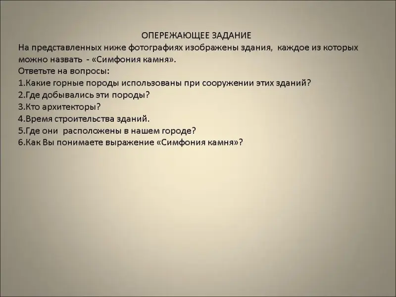 Опережающее задание: на этих фотографиях (Приложение 1) изображены здания, которые можно назвать "симфонией камня". В конце урока вы сможете ответить на вопросы: