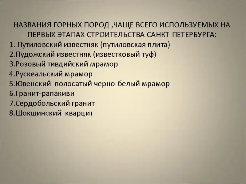 - Основные виды горных пород, используемых в архитектурном оформлении города на различных этапах его строительства.