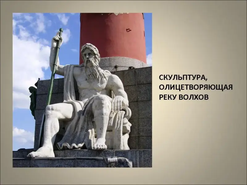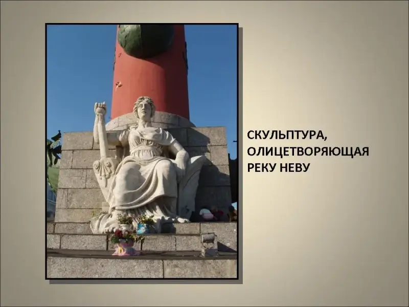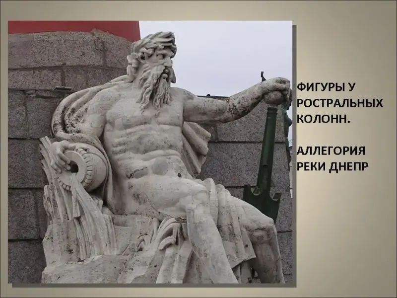 На площади, удаленные от здания Биржи, но объединенные с ним одним общим замыслом архитектора, высятся две колоссальные ростральные колонны. На постаментах у подножия каждой башни восседают по две колоссальные человеческие фигуры, изваянные из пудожского известняка. Они олицетворяют реки России: Волгу, Днепр, Неву, Волхов.