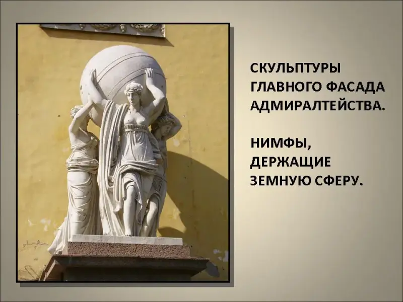 Перед главным входом в Адмиралтейство возвышаются две одинаковые скульптурные группы, выполненные из пудожского известняка, - три женские фигуры, поддерживающие небесную сферу. Аллегорический смысл этих фигур - каждая из двух групп в изображении трех нимф символизирует богиню Гекату, которая в трех своих обликах воплощала воду, землю и небо.