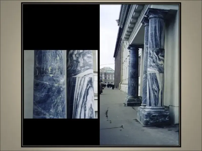 3. Время царствования Александра II - Николая II. В архитектуре Петербурга - историзм, затем модерн. Использование всего разнообразия цветного камня из Финляндии и Карелии, из окрестностей Санкт-Петербурга и новых видов камня из Польши, Германии, Финляндии, Швеции и других стран Европы. Все более богатое и изощренное использование природного камня в фасадах все возрастающего числа великокняжеских дворцов, особняков, торговых домов, банков, зданий страховых компаний, акционерных обществ, доходных домов, храмов разных духовных конфессий.