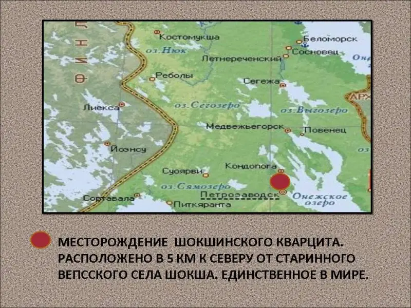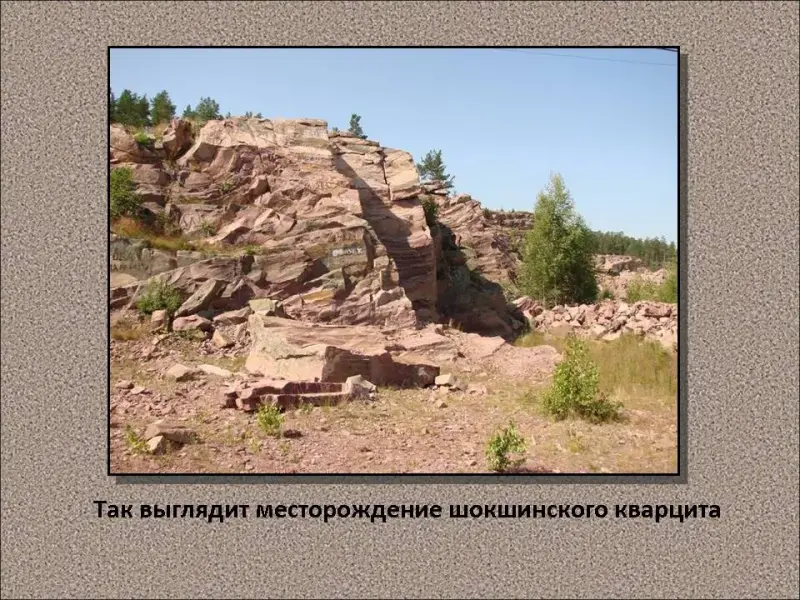 В 50 км от Петрозаводска , 5 км к северу от старинного вепсского села Шокша находится единственное в мире месторождение шокшинского малинового кварцита. Крутой берег Онежского озера в этом месте буквально испещрен каменоломнями. Камень добывается здесь карьерным способом. Место разработки малинового кварцита оставляет поистине фантастическое впечатление. Ощущение такое, что находишься на Марсе: вокруг отвесные стены марсианского кратера, под ногами крошево больших, средних и мелких обломков, и все это необычного малинового или розового цвета. [6, 7, 8, 9]