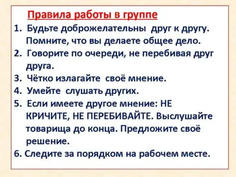 - Ребята, у нас сегодня будет проходить в основном групповая работа. Чтобы она ладилась, необходимо вспомнить правила работы в группах. (СЛАЙД 1)