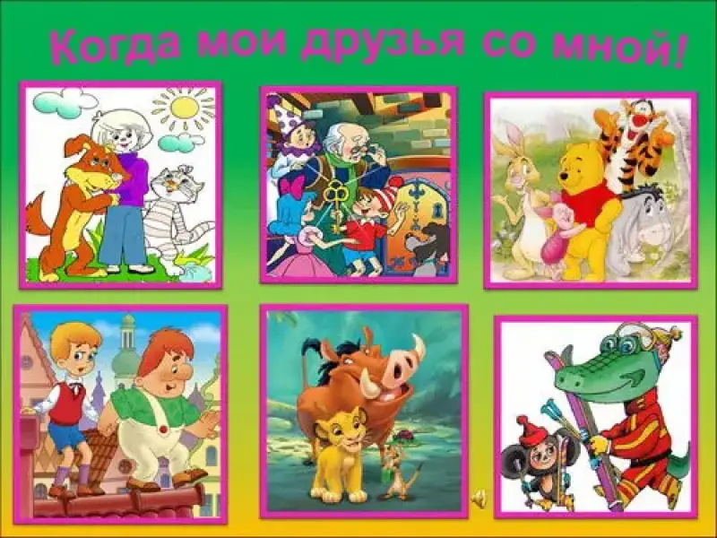 а) - Дружба нужна взрослым и детям. Детские писатели в своих произведениях часто описывают ситуации, в которых друзья приходят на помощь друг другу. Сейчас на экране появятся герои таких произведений. Узнайте их, пожалуйста, и отвечайте хором.(СЛАЙД 6)