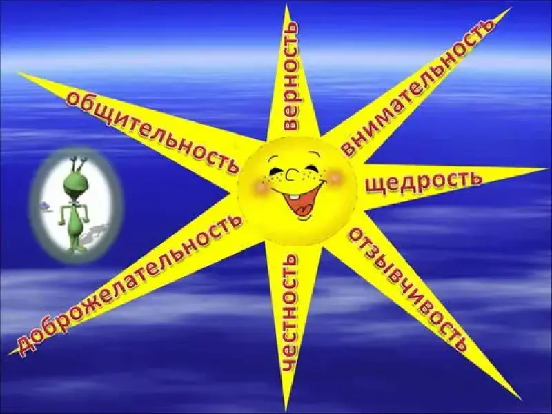 в) Настоящий друг, как солнышко, согревает, дарит радость и счастье. Его лучиками являются прекрасные качества души. Давайте откроем эти качества и зажжём это прекрасное солнышко. (СЛАЙД 8)