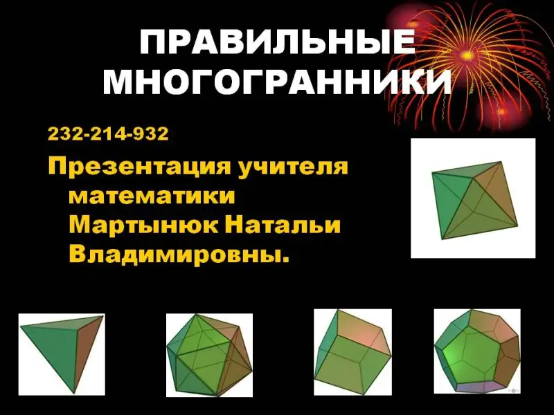 Многогранник - это такое тело, поверхность которого состоит из конечного числа плоских многоугольников. Многогранник называется правильным, если он лежит по одну сторону от плоскости любой его