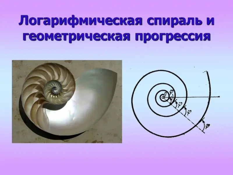 Перед вами уникальное природное создание - улитка, но еще уникальнее ее раковина. В ее основе лежит интересная математическая кривая, которая называется логарифмическая спираль. Перед вами ее изображение. Посмотрите внимательно и через несколько минут назовите связь между раковиной улитки и одной из прогрессий.