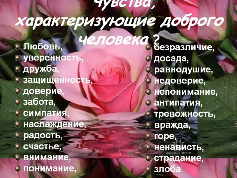 Любовь, уверенность, дружба, защищенность, доверие, забота, симпатия, наслаждение, радость, счастье, внимание, понимание, безразличие, досада, равнодушие, недоверие, непонимание, антипатия,