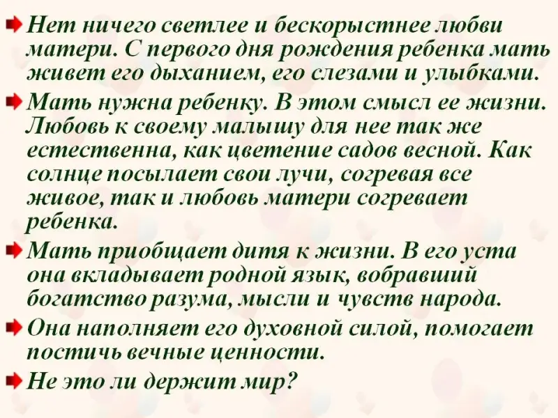 - А как вы заботитесь о своей маме? Как помогаете ей в домашних делах? (До прихода родителей с работы можно выполнить очень много домашних дел: привести в порядок квартиру, вымыть посуду, купить в магазине продукты, постирать рубашку или кофточку, отгладить школьную форму, почистить ботинки, сходить в детский сад за младшим братом или сестрой. )