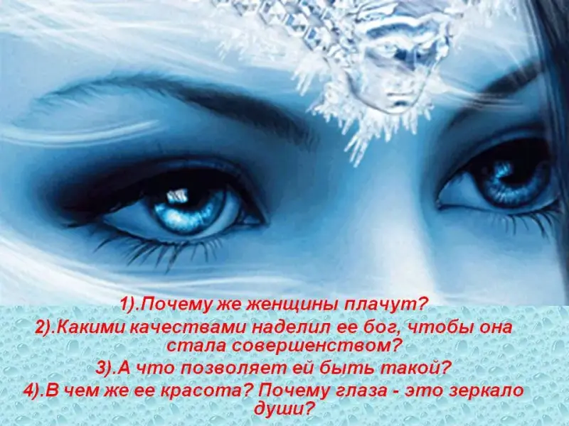 - Что можно увидеть в ее глазах, какие чувства отразятся в глазах матери или отца, если вы дети своевременно и по собственной инициативе возьмётесь выполнять часть общих домашних дел. Послушайте притчу «СЛЕЗЫ» и подумайте, почему мудрецы считают, что «глаза - это зеркало души!»?