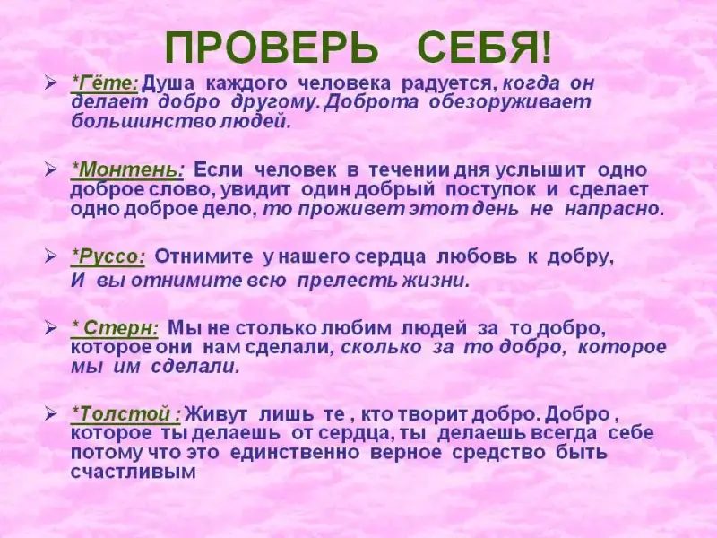 - Доброта делает человека каким? (Обаятельным, красивым. Человек, в душе которого доброта, приятно выглядит, у него выражение радости и покоя на лице и милая улыбка на губах.)
