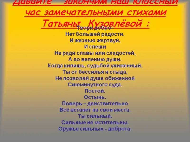 Давайте закончим наш классный час замечательными стихами Татьяны Кузовлёвой: