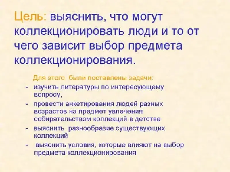 Целью работы стало выяснение вопроса о том, что могут коллекционировать люди и то от чего зависит выбор предмета коллекционирования. Для этого были поставлены задачи: изучение литературы по интересующему вопросу, проведение анкетирования людей разных возрастов на предмет увлечения собирательством коллекций в детстве и выяснение разнообразия существующих коллекций. Перед исследованием была выдвинута гипотеза о том, что человечество коллекционирует самые различные предметы.