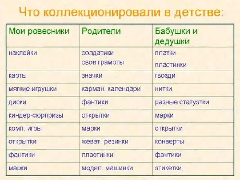 Для выяснения данных о том, что коллекционировали дети в разные времена, было проведено анкетирование среди одноклассников и других людей разных возрастов. Оказывается, что в детстве представители разных поколений собирали: