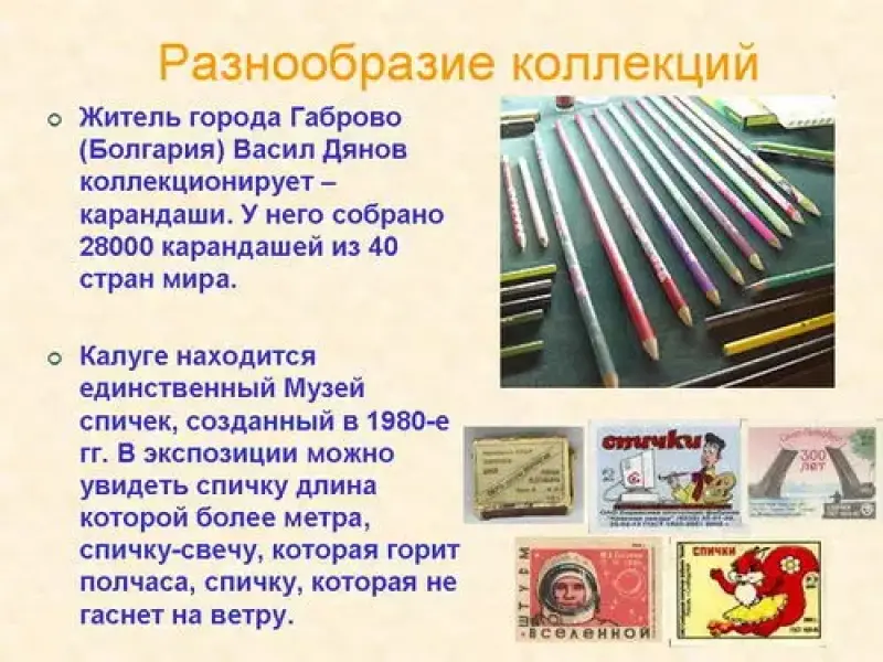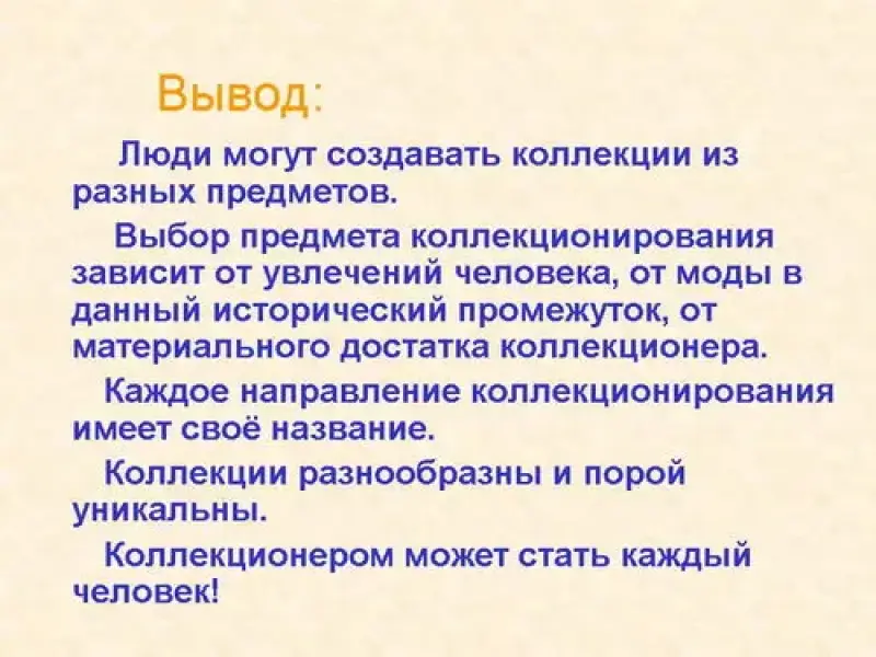 Люди могут создавать коллекции из разных предметов. Выбор предмета коллекционирования зависит от увлечений человека, от моды в данный исторический промежуток времени, от материального достатка коллекционера. Каждое направление коллекционирования имеет свое название. Коллекции разнообразны и порой уникальны. Коллекционером может стать любой человек!