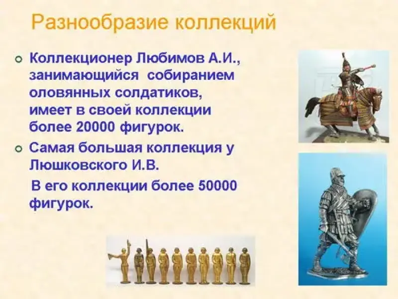 7. Коллекционер Любимов А.И., занимающийся собиранием оловянных солдатиков, имеет в своей коллекции более 20000 фигурок. Самая большая коллекция у Люшковского И.В. В его коллекции более 50000 фигурок. Сейчас его солдатики хранятся в музее Суворова.