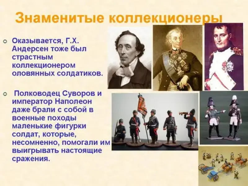 Оказывается, Г.Х. Андерсен тоже был страстным коллекционером оловянных солдатиков. Полководец Суворов и император Наполеон даже брали с собой в военные походы маленькие фигурки солдат, которые, несомненно, помогали им выигрывать настоящие сражения.