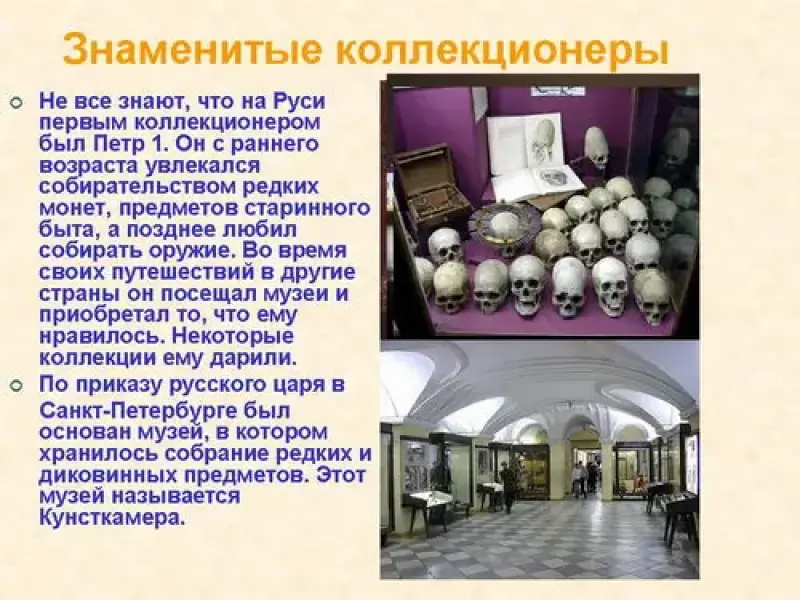 Очень многие великие люди прошлого были страстными коллекционерами. Не все знают, что на Руси первым коллекционером был Петр 1. Он с раннего возраста увлекался собирательством редких монет, предметов старинного быта, а позднее любил собирать оружие. Во время своих путешествий в другие страны он посещал музеи и приобретал то, что ему нравилось. Некоторые коллекции ему дарили. По приказу русского царя в Санкт-Петербурге был основан музей, в котором хранилось собрание редких и диковинных предметов. Этот музей называется Кунсткамера.