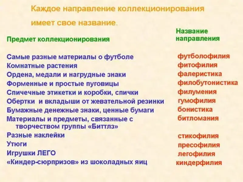 | Предмет коллекционирования | Название направления |
