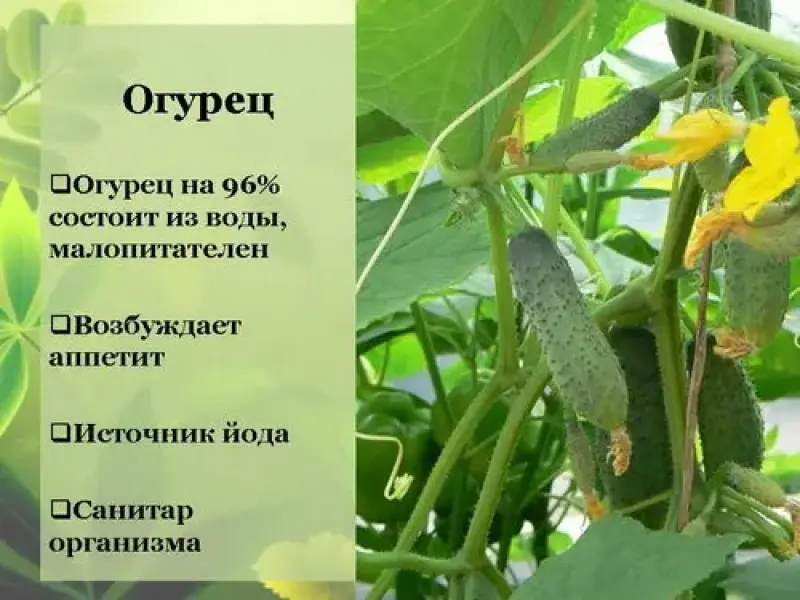 (Учитель добавляет: Огурцы на 96% состоят из воды и малопитательны, но помогают пищеварению. Они возбуждают аппетит. Огурцы - источник таких соединений йода, которые легко усваиваются организмом человека. Огурцы называют санитаром нашего организма за способность нейтрализовать кислые соединения.