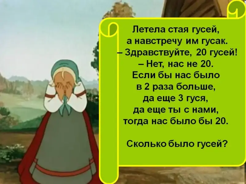- Нет, нас не 20. Если бы нас было в 2 раза больше, да еще 3 гуся, да еще ты с нами, тогда нас было бы 20. Сколько было гусей?