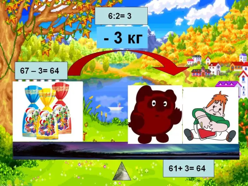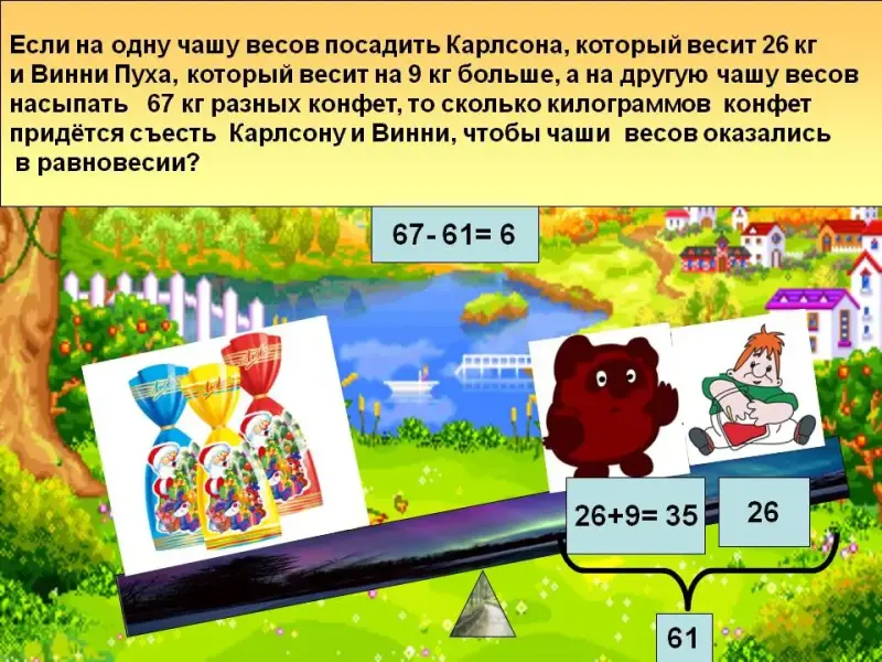 Если на одну чашу весов посадить Карлсона, который весит 26 кги Винни Пуха, который весит на 9 кг больше, а на другую чашу весов насыпать 67 кг разных конфет, то сколько килограммов конфет придётся съесть Карлсону и Винни, чтобы чаши весов оказались в равновесии?